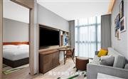 生活吧、定制冰箱、微波炉、免费 WiFi、沙发床、宽敞浴室。宽敞现代的套房(大床)设有一张特大床,房间面积为46平方米,创新的隐私屏、灵活的家具布置和创意区,为休闲、烹饪、工作提供灵活空间。放松的起居区配有沙发床,旋转式 55 英寸电视可从套房的任何角度观看。利用多功能的滚轮移动桌、舒适座椅,营造出自己的空间。设施齐全的生活吧配备定制 200L 冰箱、微波炉、水槽、胶囊咖啡机及各种必要器具,方便在客房随时准备简餐,让您乐居无束。酒店可应要求提供希尔顿惠庭旅居厨具配套,满足您烹饪所需,包括电饭煲、电磁炉。宽敞的浴室配有大梳妆台、步入式淋浴间。储物收纳灵活多样,包括开放和封闭的衣柜,让您入住期间享用更多放松空间。