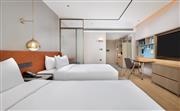 生活吧、定制冰箱、微波爐、免費 WiFi、寬敞浴室。寬敞現代的靈動豪華房(雙床)提供額外空間和設施,包括兩張 135x200cm 睡床,房間面積為30平方米,創新的隱私屏、靈活的家具布置和創意區,為休閑、烹飪、工作提供靈活空間。放松的起居區配有旋轉式 55 英寸電視,可從任何角度觀看。利用移動桌和舒適座椅,營造出自己的空間。設施齊全的生活吧配備定制 80L 冰箱、微波爐、水槽、膠囊咖啡機及各種必要器具,方便在客房隨時準備簡餐。電飯煲、電磁爐等希爾頓惠庭旅居廚具配套,可應要求提供。寬敞的浴室配有大梳妝臺、智能馬桶和步入式淋浴間。儲物收納靈活多樣,包括開放和封閉的衣柜,讓您入住期間享用更多放松空間。