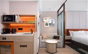 生活吧、定制冰箱、微波爐、免費 WiFi、沙發床、寬敞浴室。寬敞現代的靈動房(大床)設有一張特大床,房間面積為31平方米,創新的隱私屏、靈活的家具布置和創意區,為休閑、烹飪、工作提供靈活空間。放松的起居區配有沙發床,旋轉式 55 英寸電視可從套房的任何角度觀看。利用多功能的滾輪移動桌、舒適座椅,營造出自己的空間。設施齊全的生活吧配備定制 80L 冰箱、微波爐、水槽、膠囊咖啡機及各種必要器具,方便在客房隨時準備簡餐,讓您樂居無束。酒店可應要求提供希爾頓惠庭旅居廚具配套,滿足您烹飪所需,包括電飯煲、電磁爐。寬敞的浴室配有大梳妝臺、步入式淋浴間。